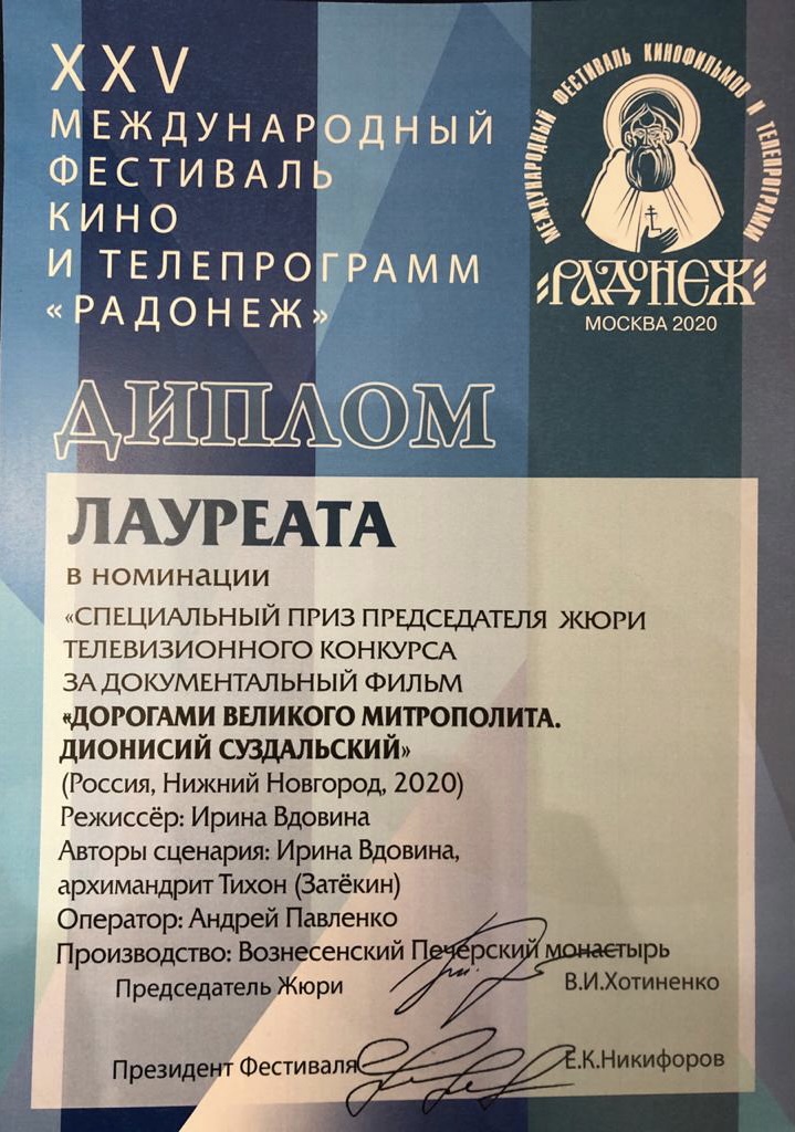 В номинации "Специальный приз Председателя жюри" диплом лауреата был вручен действительному члену Нижегородского отделения ИППО, режиссеру Ирине Вдовиной-Судьиной за фильм, снятый совместно с Нижегородским Вознесенским Печерским монастырём по благословению митрополита Нижегородского и Арзамасского Георгия к 800-летию основания Нижнего Новгорода.