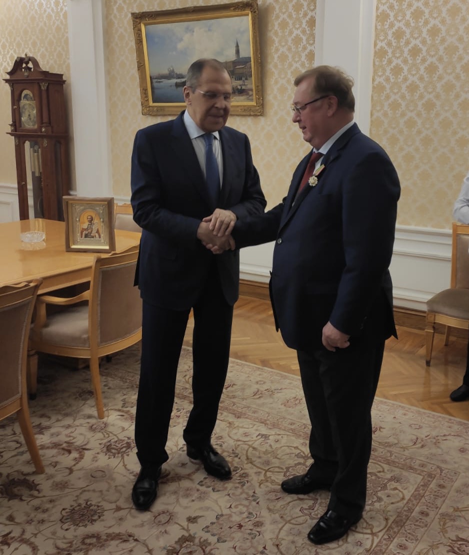 Глава МИД России Сергей Лавров вручил Председателю ИППО Сергею Степашину нагрудный знак «За вклад в международное сотрудничество»