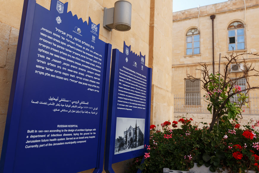 Памятные таблички на русском, английском и иврите на здании Русской больницы в Иерусалиме
