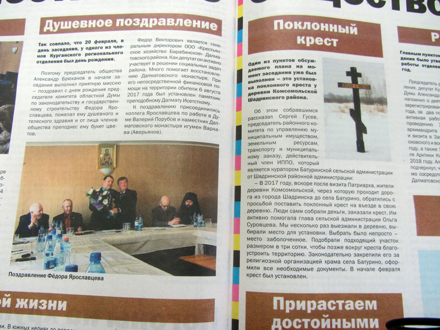 6 марта вышел в свет первый в этом году и пятый по счёту разворот под рубрикой «Преемственность поколений». Тематические страницы посвящены выездному заседанию отделения, которое прошло в стенах Далматовского Свято-Успенского мужского монастыря. Место проведения заседания выбрано не случайно: в этом году монастырь отмечает несколько значимых дат, и члены регионального отделения Общества намерены в своей работе сосредоточиться на обустройстве этой обители.