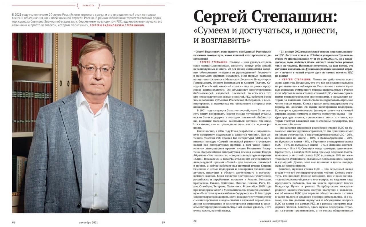 В 2021 году отмечается 20-летие Российского книжного союза, и это определенный этап не только в жизни объединения, но и всей книжной отрасли России. В рамках юбилейных торжеств главный редактор журнала Светлана Зорина побеседовала с бессменным президентом РКС, вдохновителем лучших его начинаний и просто человеком, который любит книги, Сергеем Степашиным.