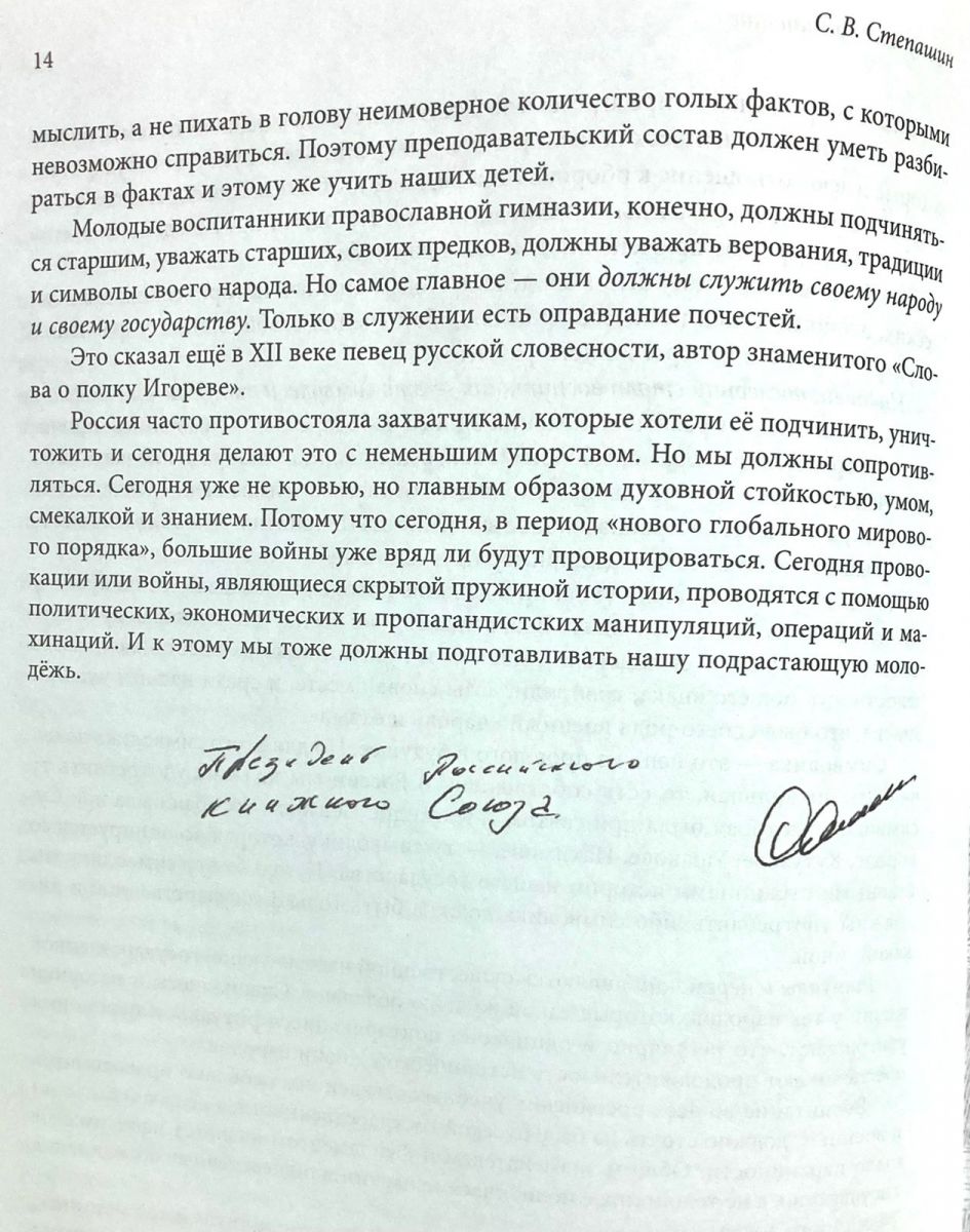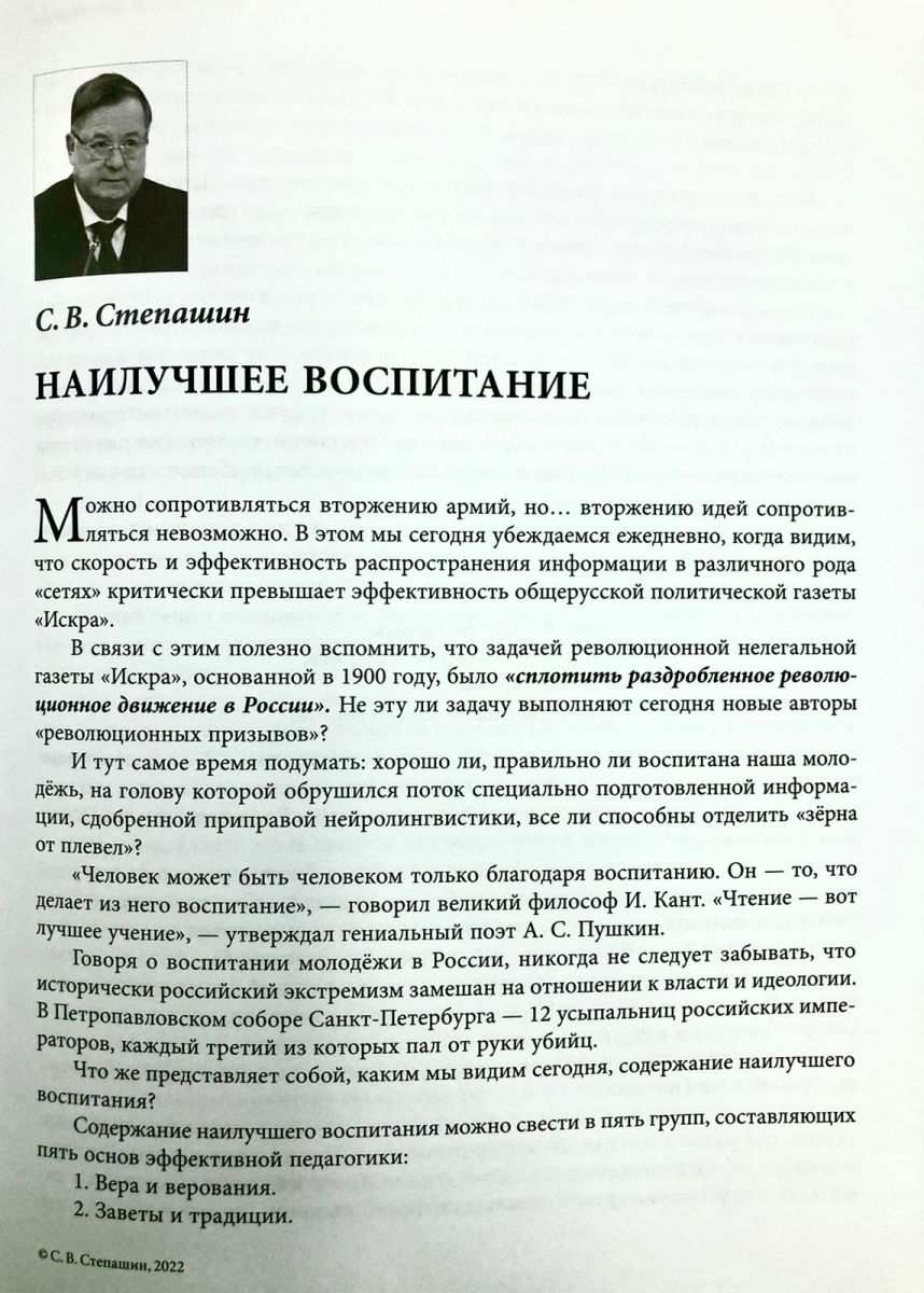 Книгу открывает статья Председателя ИППО, Президента Российского книжного союза С.В. Степашина «Наилучшее воспитание», в которой автор с болью задается вопросом: «Хорошо ли, правильно ли воспитана наша молодежь, на голову которой сегодня обрушился поток специально подготовленной деструктивной информации?»