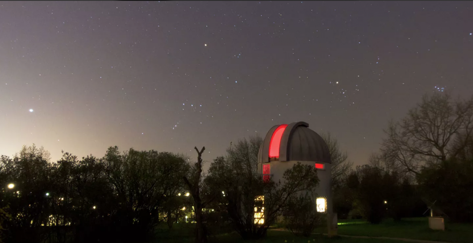 Обсерватория Йоханнеса Кеплера в Линце, Австрия, в ясную ночь. В небе видна яркая звезда Сириус, созвездие Орион, а также звездные скопления Гиады и Плеяды