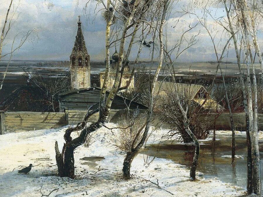 Справка: «Грачи прилетели» — хрестоматийный пейзаж русского художника Алексея Саврасова (1830—1897), созданный в 1871 году. Хранится в Государственной Третьяковской галерее (размер — 62 × 48,5 см). Это полотно считается самым известным произведением Саврасова, а его появление рассматривается как важный этап в развитии русской пейзажной живописи. Саврасов начал свою работу над «Грачами» в марте 1871 года. Натурные этюды к будущему полотну были написаны художником во время его поездки в Костромскую губернию, когда он находился в селе Молвитино (ныне посёлок Сусанино Костромской области). Прообразом храма, изображённого на картине, является построенная в конце XVII века Воскресенская церковь, сохранившаяся до наших дней. Место, где работал художник, подтверждается его надписью, сделанной в левом нижнем углу полотна: «1871. С. Молвитино. А. Саврасовъ». Полотно было названо художником «Вот прилетели грачи». Летом 1871 года картина была приобретена у Саврасова Павлом Третьяковым.