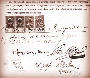 Первым пунктом контракта было отмечено, что „сюжеты картин могут быть только библейского и историко-поучительного характера“, а пунктом 15 уточнялось, что картины „историко-поучительного содержания должны быть преимущественно из отечественной истории“. В наследство от судебного пристава Кравченко, который, по всей видимости, был предыдущим арендатором павильона, новый хозяин получил картину „Битва под Лейпцигом“ с дальнейшим правом отказа от ее хранения. За все Хмелиовский в конкретно определенные контрактом дни должен вносить в городскую управу по четыреста рублей арендной платы дважды в год — заранее за полгода, что в сумме составило 800 рублей.