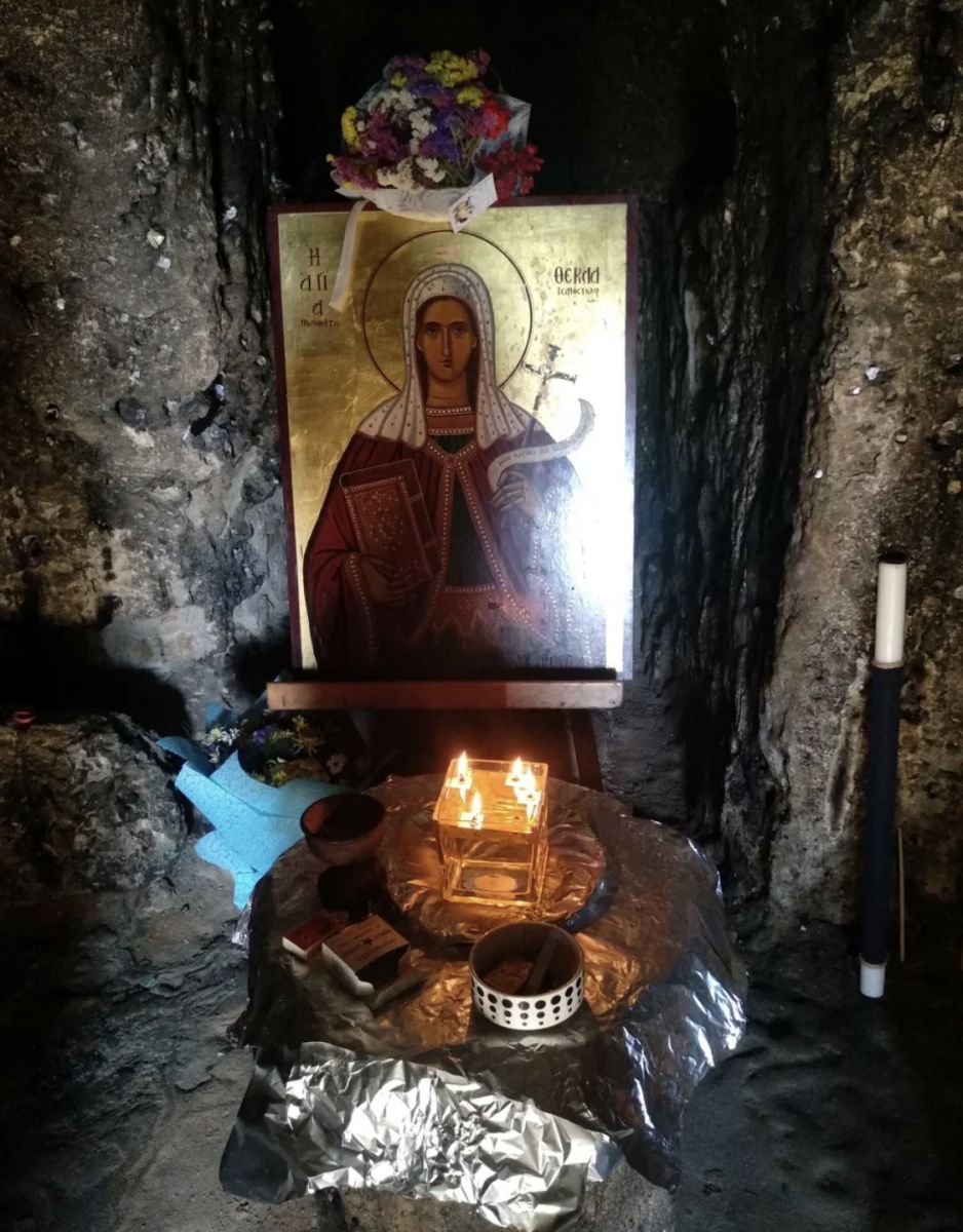 Спускаясь от церкви вниз, по лестнице, к морю, можно увидеть небольшую церковь, высеченную в скале в виде креста. Она появилась здесь около 45 года от Рождества Христова. Над входом стоит православный крест с надписью: «Агия Фёкла». В этой небольшой катакомбной церкви стоят иконы святой Фёклы, всегда горят свечи и лампады. Паломники приносят цветы, украшения в знак благодарности святой Фёкле, завязываю ленточки на кустарниках в знак исполнения желаний.