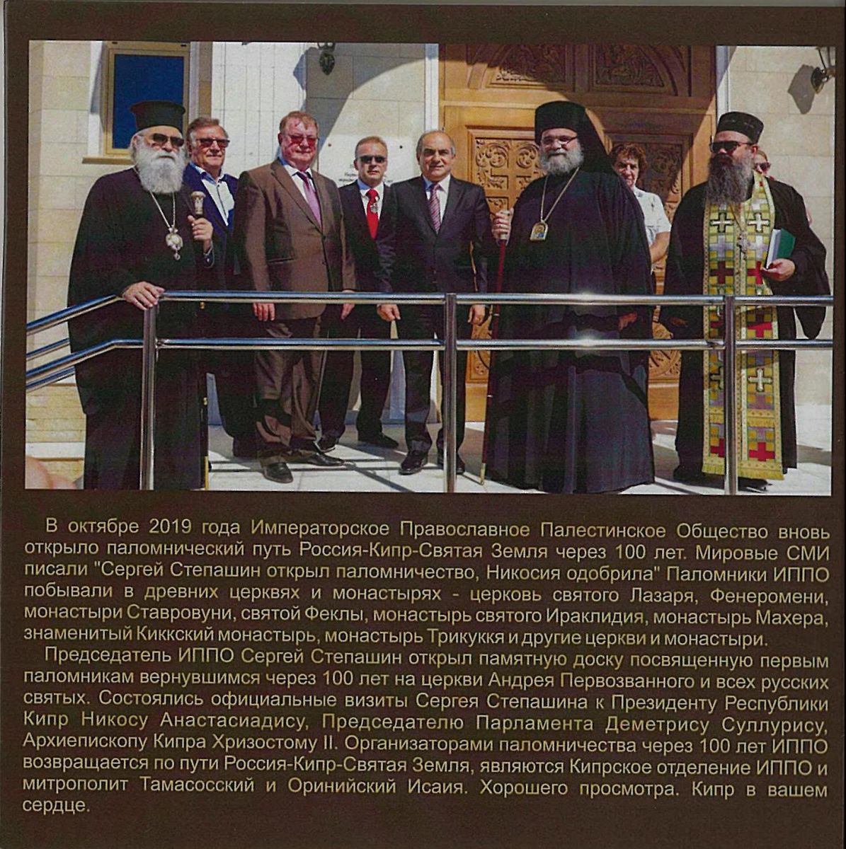 В октябре 2019 года Императорское Православное Палестинское Общество вновь открыло паломнический путь Россия-Кипр-Святая Земля через 100 лет.