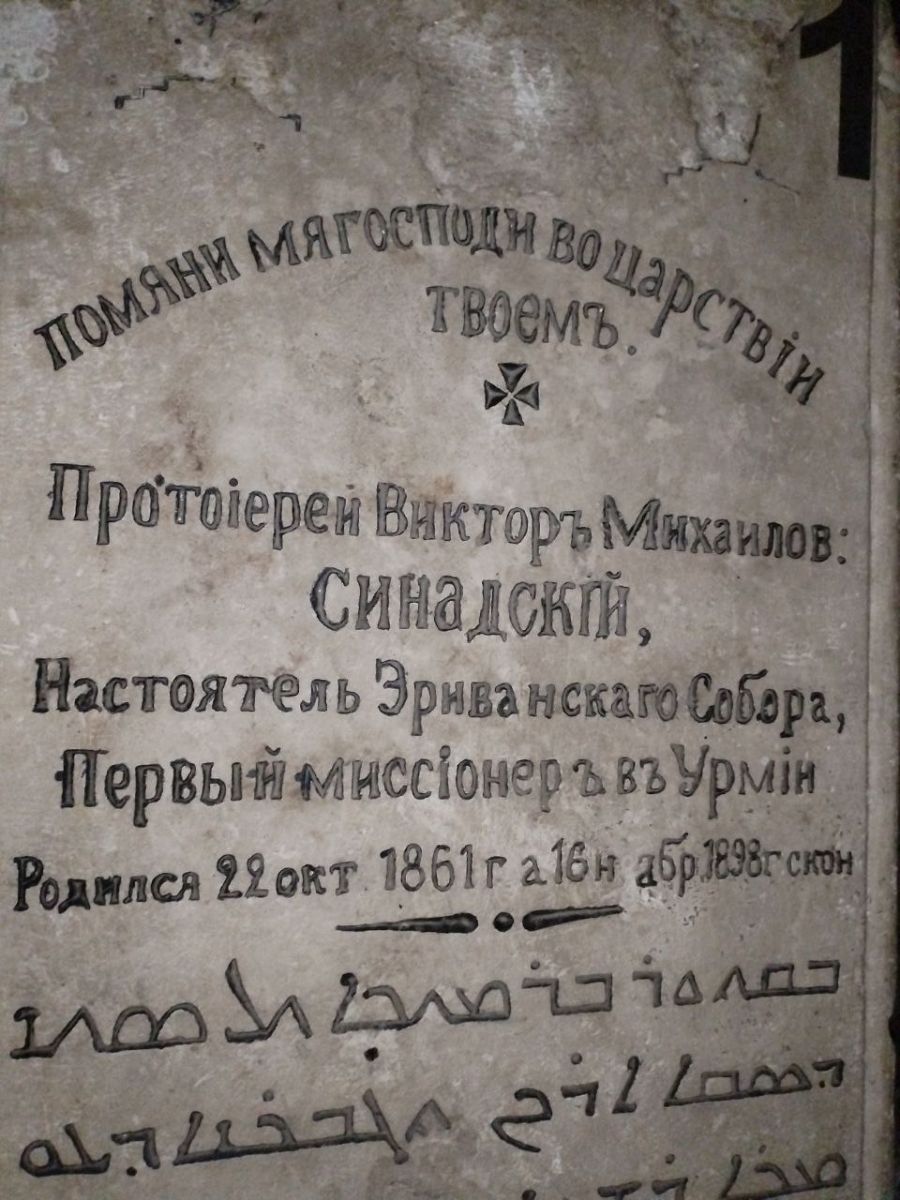На покрывающем могилу протоиерея Виктора Синадского надгробии высечена надпись: «Протоiерей Викторъ Михаилов(ич) Синадскiй, Настоятель Эриванскаго Собора, Первый миссiонеръ въ Урмiи. Родился 22 окт(ября) 1861 г., а 16 н(о)абр(я) 1898 г. скон(чался)». Он прожил всего лишь 37 лет, но с его именем будет навсегда связана не только история Кафедрального собора в Ереване, но и учреждение Духовной миссии в Урмии. По разным данным, на территории Персии в конце XIX – начале XX вв. существовало около 50 (!) православных приходов, но именно ассирийский храм в Урмии стал местом упокоения епископа Илии и протоиерея Виктора: у их могил игумен Серафим (Кравченко) совершил заупокойную литию.