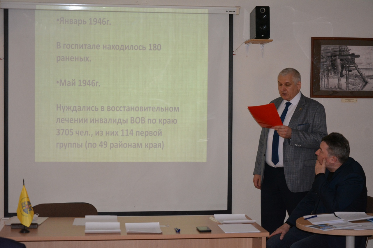 Заседание началось с презентации фильма об истории и современной жизнедеятельности Красноярского краевого госпиталя. О вкладе в Победу в Великой Отечественной войне Красноярского эвакогоспиталя, о самоотверженности медицинских работников госпиталя рассказал начальник Красноярского краевого госпиталя ветеранов войн Петр Вдовенко.