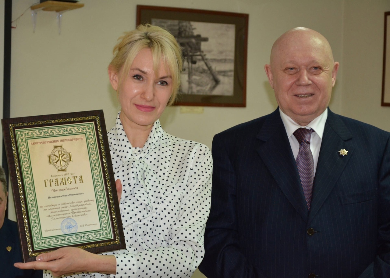 В завершении заседания руководитель регионального отделения Общества Сергей Гонюхов, по решению Совета ИППО вручил грамоту за активную работу в Обществе Инне Полынцывой, подписанную Председателем ИППО Сергеем Степашиным. Инна Николаевна также удостоилась медали Красноярской Епархии Русской православной Церкви Святой Великомученицы Праскевы Пятницы.
