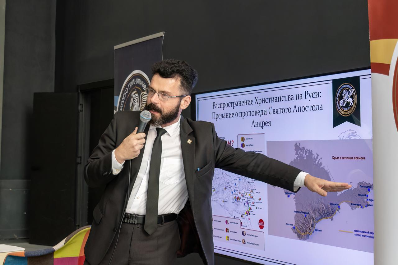 Заведующий НИЛ «Сакральные ландшафты Византийского порубежья» СевГУ показал, как на протяжении тысячелетия история России была неразрывно связана с историей Церкви. В своем выступлении он подчеркнул, что Церковь всегда была не просто духовным, но и важнейшим государствообразующим элементом, своеобразным «цементирующим фактором», формировавшим русскую идентичность.