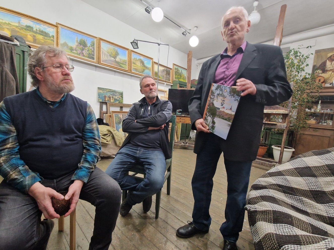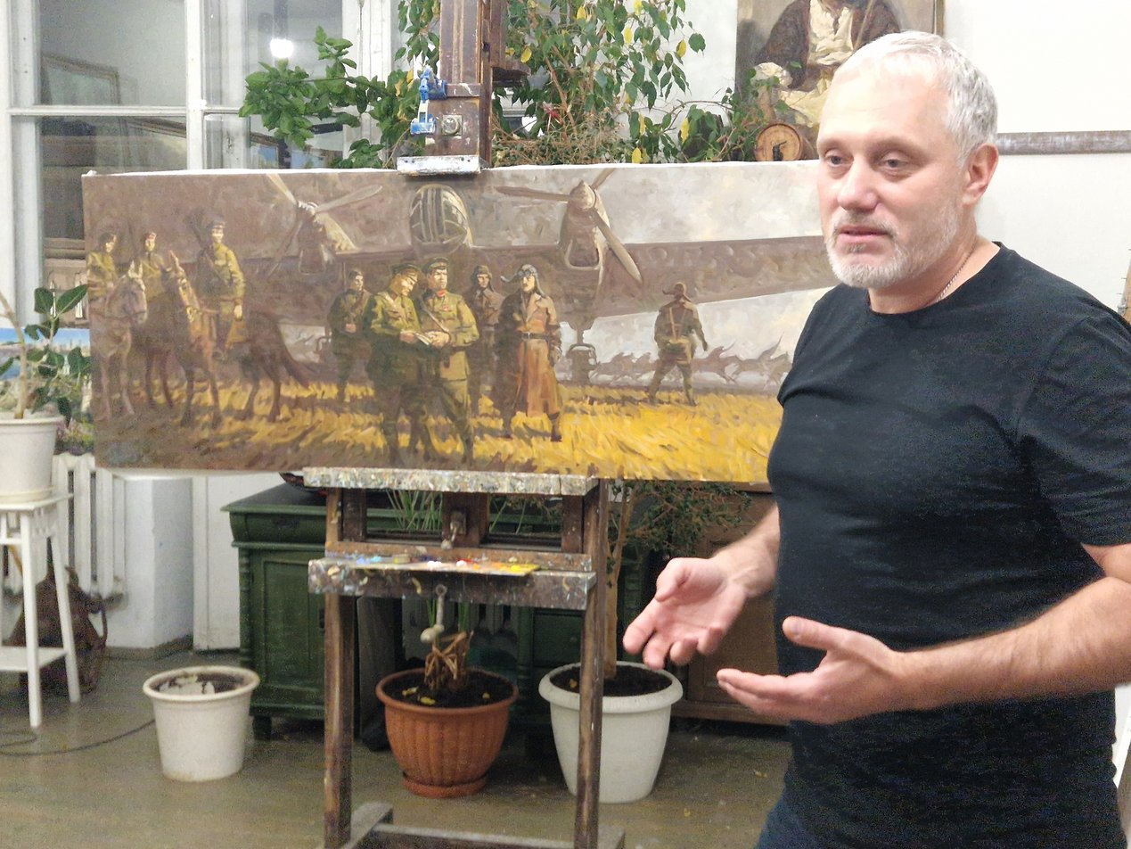 Гостеприимный хозяин студии художник Александр Ремезов представил собравшимся свою новую историческую работу, посвященную событиям на Халкин-Голе. Александр весной этого года под эгидой Российской Академии Художеств в составе группы из 15 русских художников посетил Монголию, где прошёл российско-монгольский пленэр «Под небом Победы», посвященный 85-летию победы советско-монгольских войск над японской армией на реке Халхин-Гол. Итоги пленэра «Под небом Победы» были представлены в Улан-Баторе на приеме в Российском посольстве по случаю 79-й годовщины Великой Победы 1945 года и на отчетной выставке в галерее Союза художников Монголии.