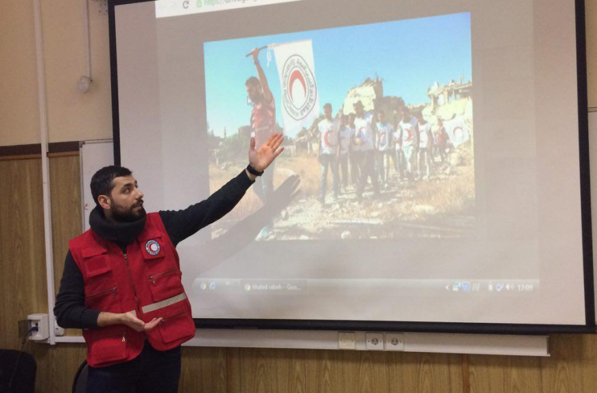Халед Рабех, который был сначала волонтёром, а ныне сотрудник Сирийского Арабского Красного Полумесяца, рассказал о масштабах гуманитарной ситуации в Сирии. Он сопровождает гуманитарные конвои в самые горячие регионы Сирии, вывозит детей и женщин из районов, находящихся под контролем террористов, помогает обессиленным людям. За годы войны в Сирии погибли 65 человек – коллег Халеда. Своё повествование о гуманитарной катастрофе в Сирии Халед подкрепил демонстрацией фотографий и видеозаписей.