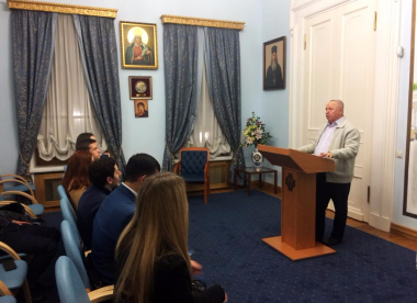 В начале встречи Роман Плюта рассказал студентам Высшей школы экономики, членам и гостям Ближневосточного клуба НИУ ВШЭ об истории Императорского Православного Палестинского Общества и современной международной, гуманитарной, научной и просветительской деятельности.