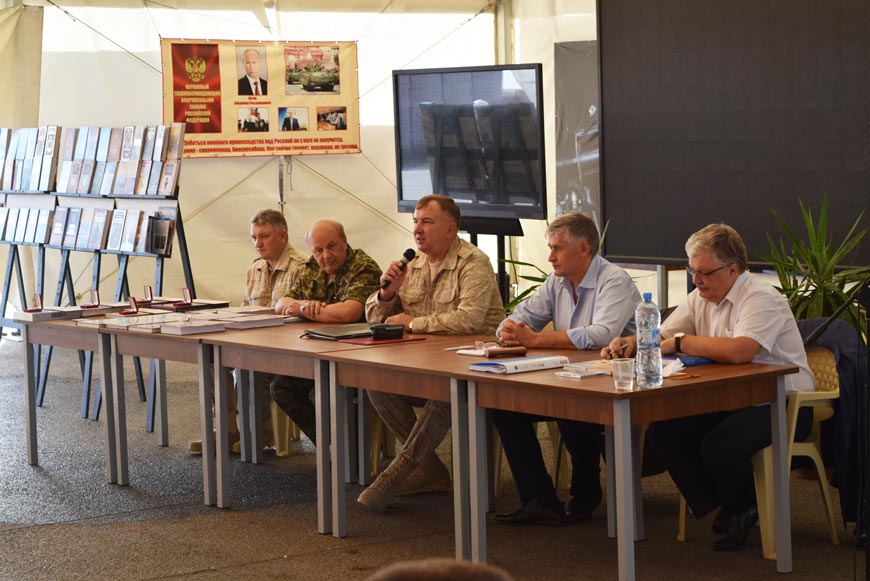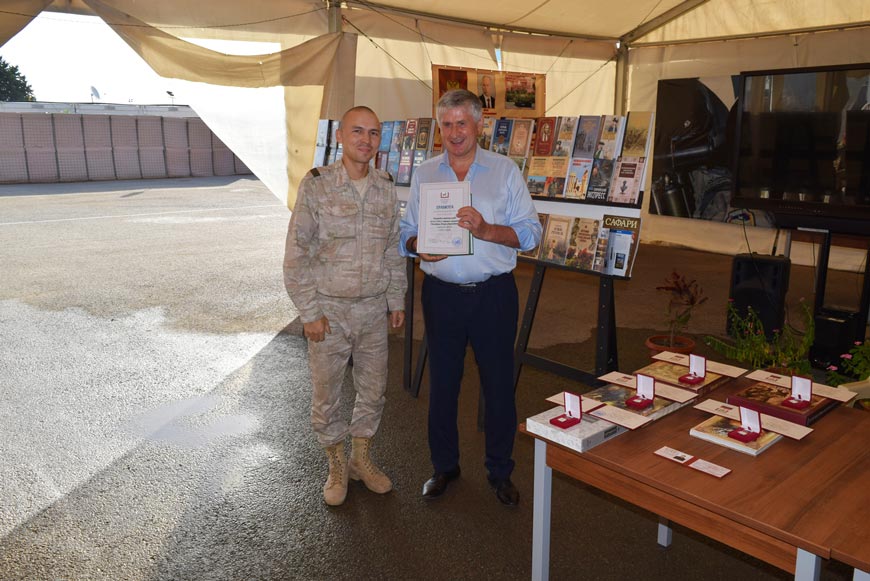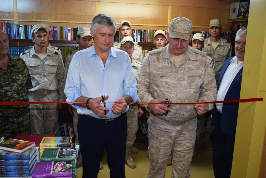 Делегация приняла участие в открытии нового блока библиотеки. В фонд библиотеки поступили произведения классиков русской литературы, современная художественная и научно-популярная литература, красочные альбомы и сборники журналов. Участники делегации обратили внимание, что книги, которые находились в библиотеке, были зачитаны «до дыр» военными и были рады, что смогли заметно пополнить фонд новыми интересными, красочными изданиями самых разных жанров. С особенным интересом военные листали книжные серии: продолжающую идею серии игр S.T.A.L.K.E.R. и серию «Вселенная метро 2033», которые выходят в издательстве «Эксмо». После открытия члены делегации в сопровождении российской группировки повезли «библиотечки» на сторожевую заставу, где вручили их военным и поговорили о литературном творчестве. По окончании встречи на сторожевой заставе состоялся концерт, и все делились друг с другом впечатлениями и эмоциями о мероприятии.