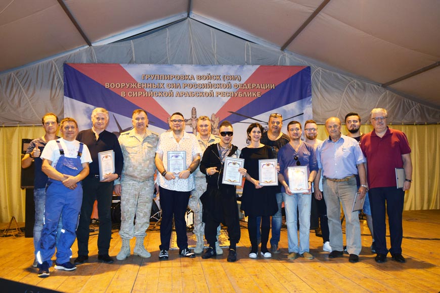 В литературный десант вошли главный редактор издательства «Вече» Сергей Дмитриев и председатель правления Союза писателей России, военный писатель и журналист Николай Иванов. Возглавил делегацию управляющий вице-президент Российского книжного союза, генеральный директор издательства «Вече» действительный член ИППО Леонид Палько. Кроме писателей и издателей в Сирию прилетели рок-группа «Команда Баг», певец Евгений Холмский, группа «Турбо Мода» и финалист конкурса «Голос» Сергей Михайлин.