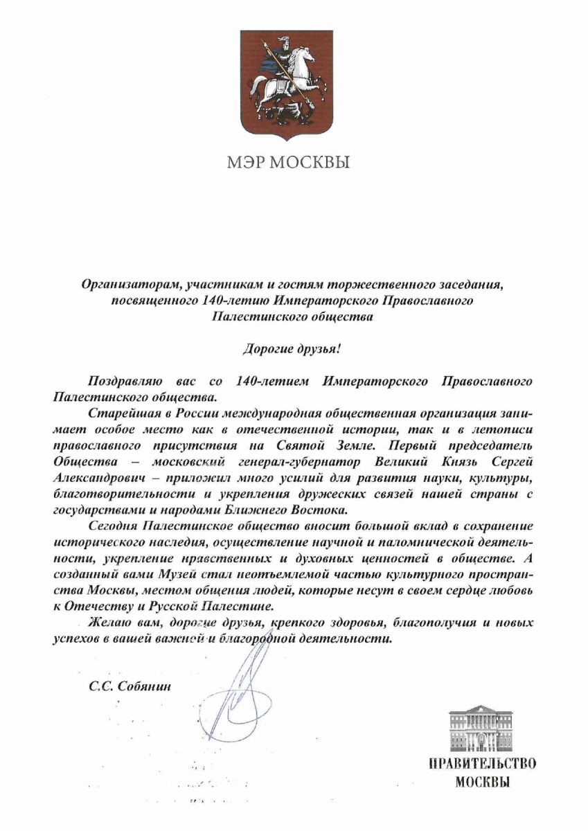 Мэр Москвы, Почётный член ИППО Сергей Собянин направил приветствие участникам торжеств по случаю 140-летия ИППО