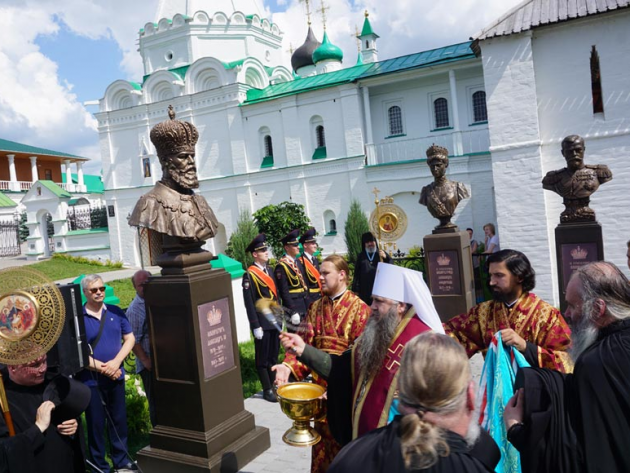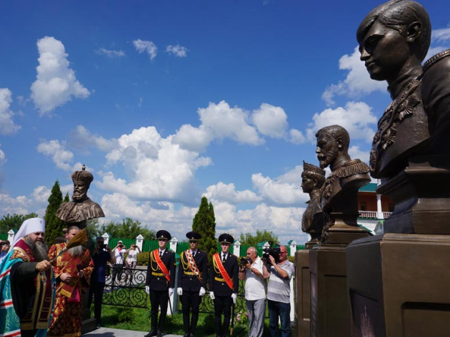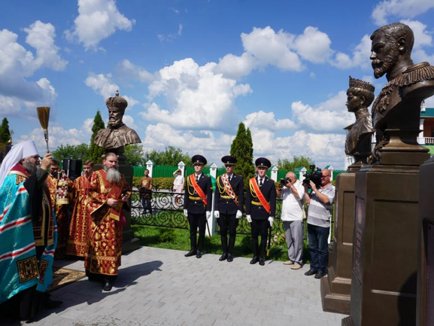 После облачения Его Высокопреосвященство совершил чин освящения новых установленных памятников святым Царственным страстотерпцам: Императору Николаю Александровичу, Императрице Александре Феодоровне и наследнику Цесаревичу Алексею Николаевичу, а также российским императорам: Александру III, Александру II, Александру I и Николаю I.