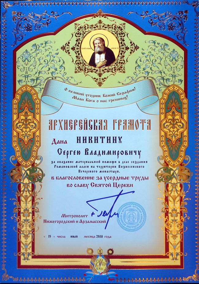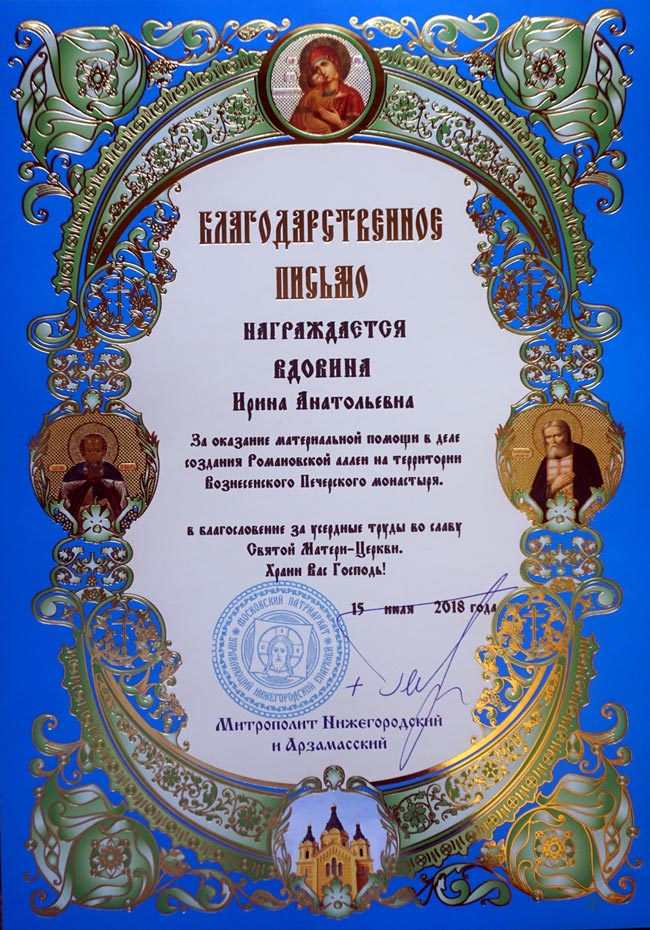 После приветственного слово о. Тихона Его Высокопреосвященство удостоил трёх благотворителей данного проекта, действительных членов Нижегородского отделения ИППО архиерейскими грамотами. Архиерейской грамотой за понесённые труды по созиданию Романовской аллеи Славы были удостоены: Никитин Сергей Владимирович и Судьин Сергей Борисович. Архиерейским благодарственным письмом отмечена Вдовина Ирина Анатольевна.