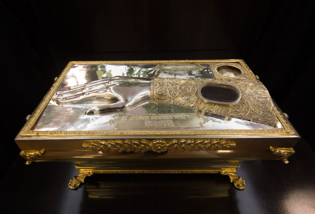Святыню доставил из Знаменского Синодального собора Нью-Йорка председатель молодёжного синодального отдела Русской Православной Церкви Заграницей протоиерей Андрей Соммер. В ковчеге также находится частица мощей мученицы инокини Варвары.