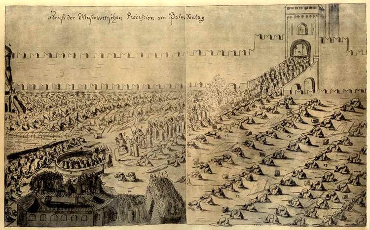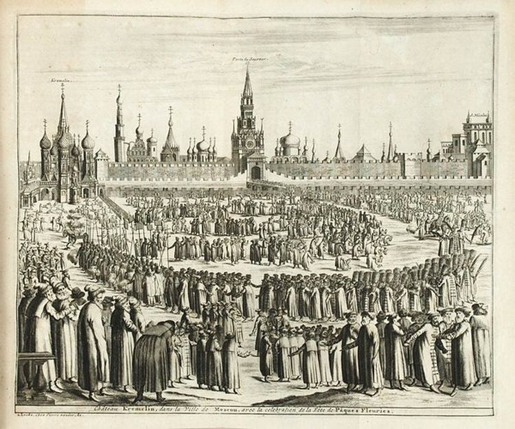 Потом процессия была вынесена за пределы Кремля – от Успенского собора к храму Покрова на Рву, где имелся придел Входа Господня в Иерусалим, и затем возвращалась обратно. И, наконец, с 1656 г. собственно шествие начиналось за пределами Кремля, у Лобного места, символизировавшего Голгофу (от Успенского собора к приделу Покровского храма шел крестный ход), и направлялось в Кремль, в Успенский собор. С конца 1660-х гг. такие же обряды совершались и в некоторых других русских городах-центрах епархий (Астрахани, Казани, Тобольске), пока в 1678 г. они не были запрещены везде, кроме Москвы, где в церемонии участвовали царь и патриарх. В Москве шествие на осляти проводилось до конца XVII в. (по крайней мере, до 1693 г.). Сведения об этом обряде сохранились как в иностранных (сочинения Адама Олеария, Павла Алеппского, Августина Мейерберга и др.), так и в русских источниках.