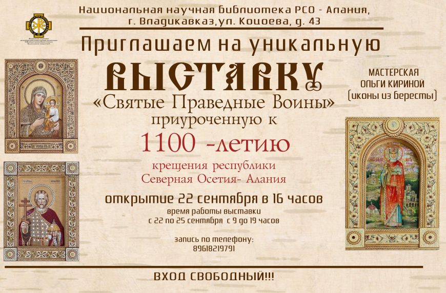 Открытие состоится 22 сентября в 16 часов по адресу г. Владикавказ, ул. Коцоева, д. 43, время работы выставки с 9 до 19 часов с 22 по 25 сентября 2022 года. В экспозиции более пятидесяти икон, писаных на бересте. Возрождением этого древнейшего вида искусства мы обязаны Ольге Кириной. В 2000 году, получив благословение Церкви, Ольга Кирина стала серьёзно заниматься берестой, разработав собственный уникальный стиль изготовления икон. Археологические данные подтверждают глубочайшую древность существования этого вида иконописи на Руси. При раскопках в Великом Новгороде был обнаружен небольшой лист бересты с процарапанными изображениями фигур, в которых можно было узнать образы Иисуса Христа и Св.Варвары. Здесь же и и дата, читаемая, как 6537 от сотворения мира, что соответствует 1029 году от рождества Христова.