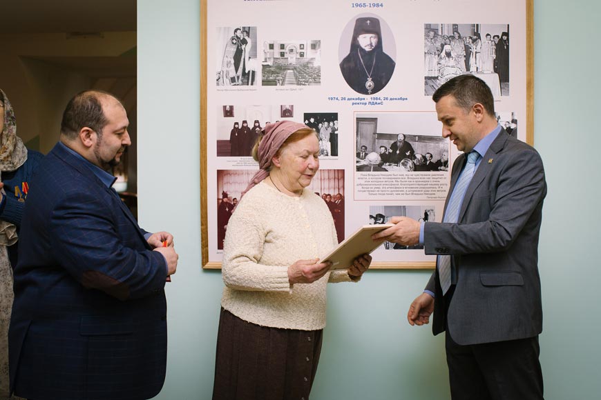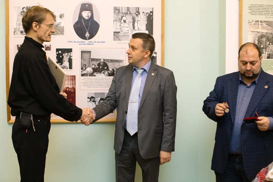 После торжественного открытия и освящения памятных досок в древлехранилище Свято-Троицкой Александро-Невской Лавры состоялось торжественное мероприятие, в ходе которого инициаторы установки памятных досок – руководители благотворительного фонда «Возрождение культурного наследия» и историко-исследовательского центра «Архивное дело» Александр Николаевич Панин и Семён Яковлевич Ваксман – вручили награды своим петербургским единомышленникам.