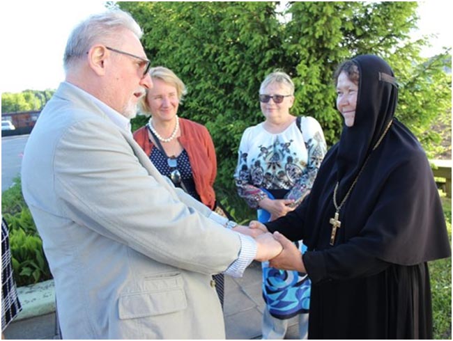 – Мы благодарны Орловскому отделению ИППО за предоставленную возможность побывать здесь. То, что существует эта усадьба, для нас всех в хорошем смысле – это открытие. Мы благодарим за гостеприимство матушку, главу района Сергея Александровича. Благодаря вашим трудам наше культурное, духовное наследие сохраняется. Это рождает надежду на то, что мы сможем помочь мемориализовать это место, развить монастырь, школу. Мы будем думать, какой проект реализовать здесь, конечно, в соавторстве с вами, – сказал С. Ю. Житенёв в трапезной, куда матушка пригласила отведать молочные продукты с монастырской мини-фермы, свежий мёд из одуванчиков и собственноручно испечённые блины. – Посещение села Долбенкино – это бесценный подарок, который нам предоставила Орловская земля. Мы обязательно подумаем о развитии и сохранении этого наследия. Я очень порадовался. Живёт монастырь, он развивается, превращается в градообразующее предприятие. Здесь жива школа, есть дети. Помогают глава района, все местные жители. Это счастье! Земным поклоном благодарим вас и желаем следовать Божьему повелению. Только с Божьей помощью можно сделать всё.