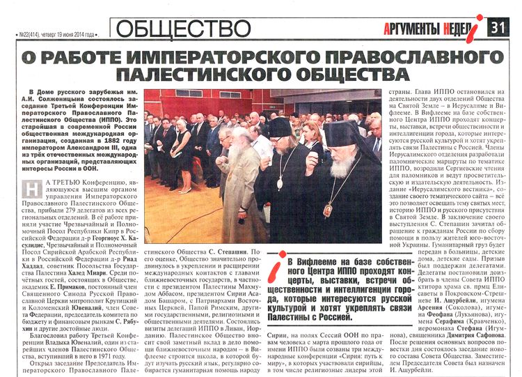 В Вифлееме на базе собственного Центра ИППО проходят концерты, выставки, встречи общественности и интеллигенции города, которые интересуются русской культурой и хотят укреплять связи Палестины с Россией. Члены Иерусалимского отделения разработали паломнические маршруты по тематике ИППО, возродили Сергиевские чтения для паломников и ведут просветительскую и издательскую деятельность. Издание «Иерусалимского вестника», создание своего тематического сайта – всё это позволяет освещать тему святых мест, историю ИППО и русского присутствия в Святой Земле. В заключение своего выступления С. Степашин зачитал обращение к гражданам России по сбору помощи в пользу жителей юго-восточной Украины. Гуманитарный груз будет передан в больницы, детские дома, детские сады.