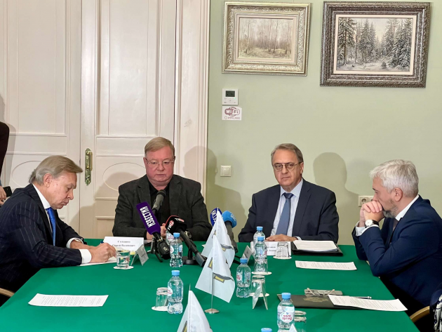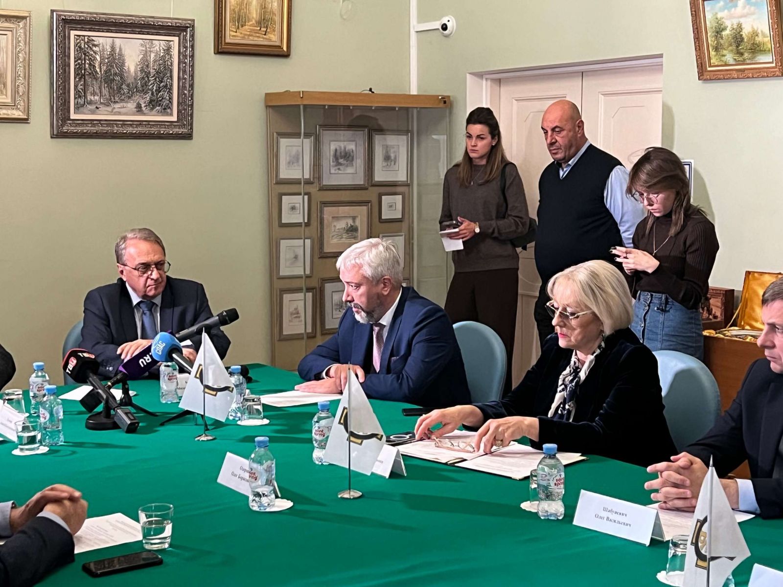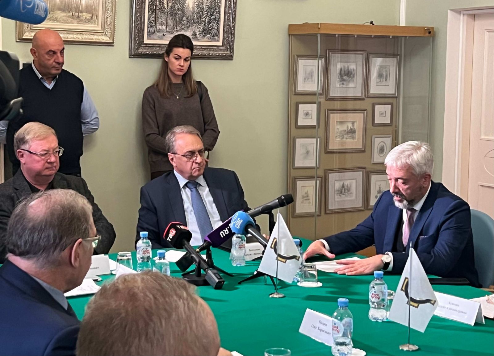 Затем Председатель Общества передал слово специальному представителю Президента Российской Федерации по Ближнему Востоку и странам Африки, заместителю Министра иностранных дел РФ Михаилу Богданову.