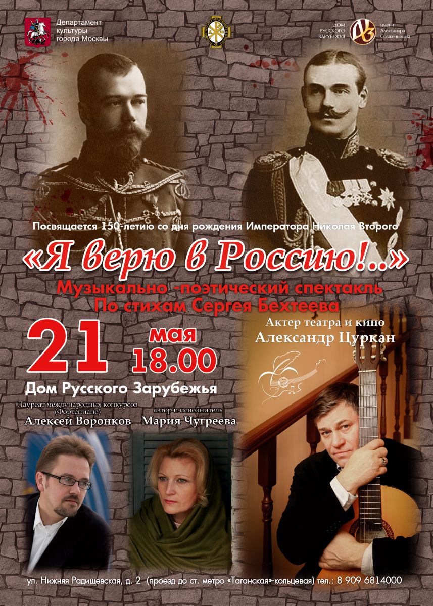 Участникам собрания клуба будет представлен музыкально-поэтический спектакль по стихам поэта Сергея Бехтеева «Я верю в Россию!» в постановке Александра Цуркана.