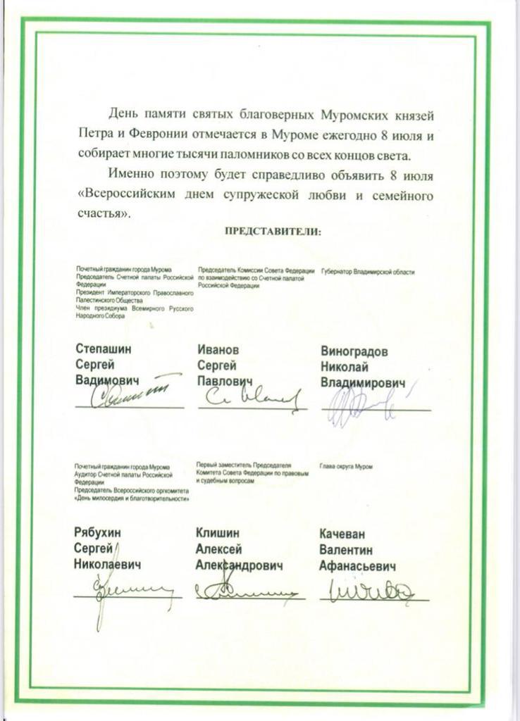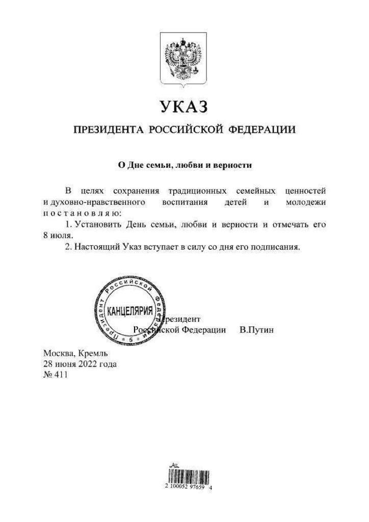 «В целях сохранения традиционных семейных ценностей и духовно-нравственного воспитания детей и молодежи постановляю: установить День семьи, любви и верности и отмечать его 8 июля», — говорится в документе.