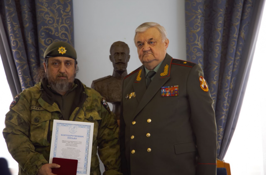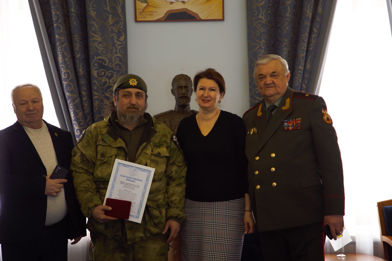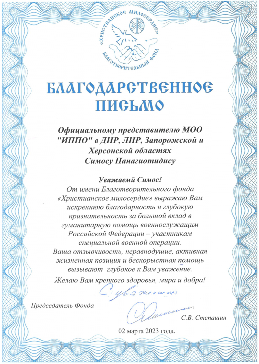 Официальному представителю Общества в ДНР, ЛНР, Херсонской и Запорожской областях вручено благодарственное письмо и Почетная настольная медаль первых Председателей ИППО