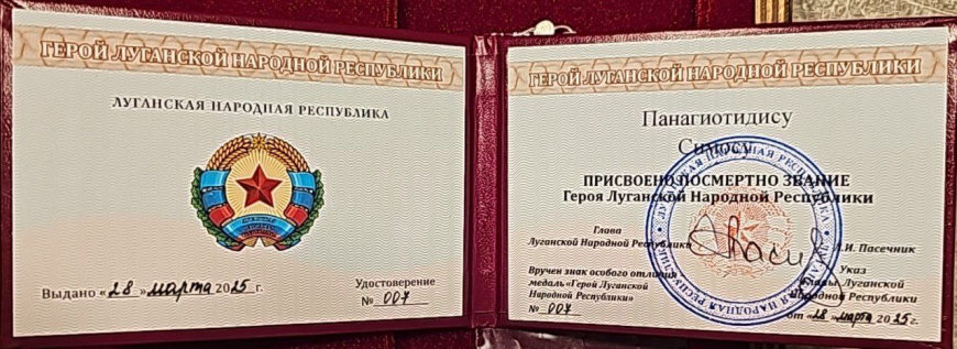 Официальный представитель Общества в ДНР, ЛНР, Запорожской и Херсонской областях Симос Панагиотидис удостоен звания «Герой Луганской Народной Республики» посмертно