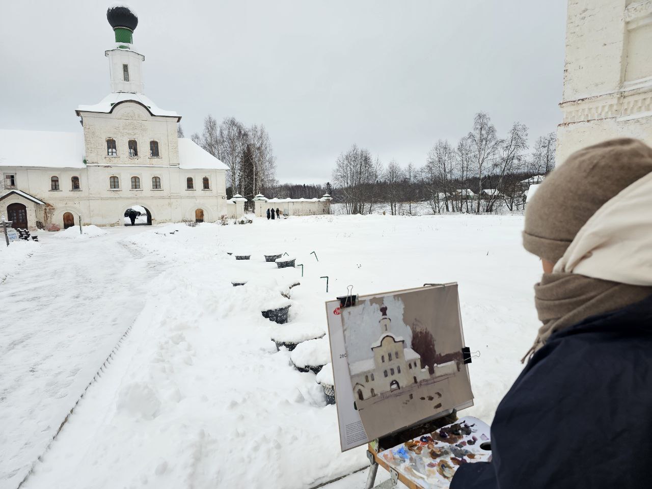 В Антониево-Сийском монастыре делегация ознакомилась с музеем обители, в которой был насильно пострижен в монахи основатель династии Романовых боярин Федор Никитич Романов, и выслушала лекцию члена ИППО архитектора Дмитрия Яскорского. Также был проведен пленэр.
