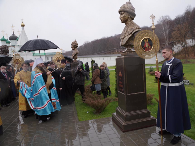 Заместитель председателя Нижегородского отделения ИППО, настоятель Печерского монастыря архимандрит Тихон (Затёкин) от имени братии обители преподнёс в дар митрополиту Георгию копию бюста первого правившего в России представителя династии Романовых царя Михаила Фёдоровича. «В этот благодатный день, несмотря на погодные условия, совершено великое благодеяние. По Вашему святительскому благословению мы подъяли скромный труд, чтобы в стенах Печерской обители появилась аллея правителей династии Романовых, которые созидали и собирали нашу страну от Балтики до Тихого океана, приумножая славу нашей Родины», – отметил отец Тихон.