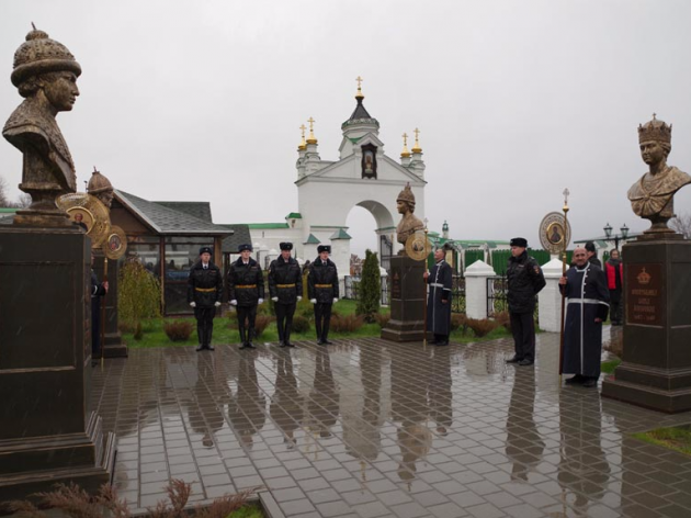 Почётные гости поклонились иконе Божией Матери Печерская в Успенском храме обители, а затем собрались на территории аллеи, где в присутствии кадетов, курсантов Нижегородской академии МВД России и хоругвеносцев глава Нижегородской митрополии совершил чин освящения первых шести бюстов представителей царствовавшей в России с 1613 по 1917 год династии Романовых.