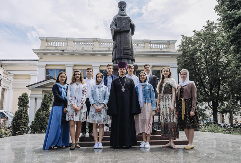 Протоиерей Сергей Ткаченко с выпускниками у памятника святителя Иннокентия Одесского