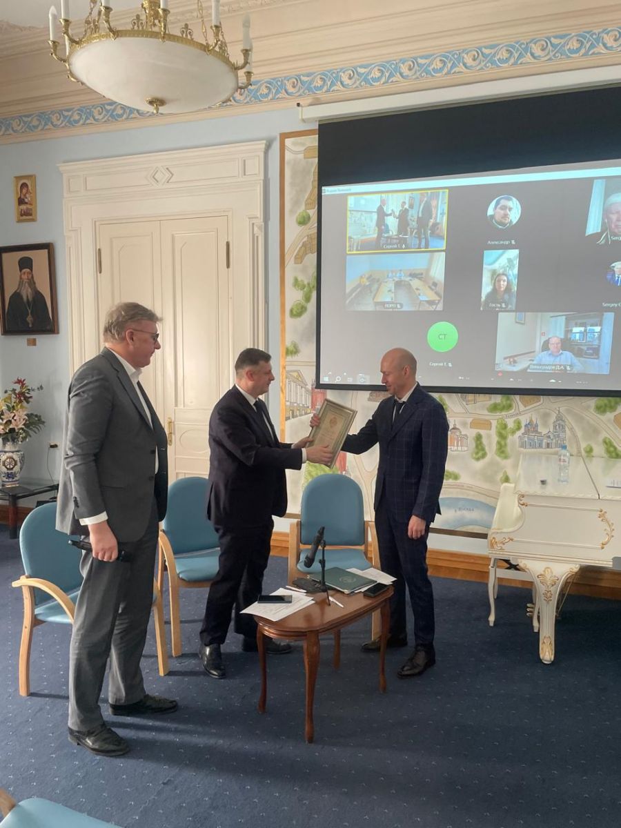 В завершении встречи, заместитель Председателя ИППО Олег Шабуневич вручает грамоту ИППО генеральному директору АНО "Центр "Арктические инициативы" Рустаму Романенкову.