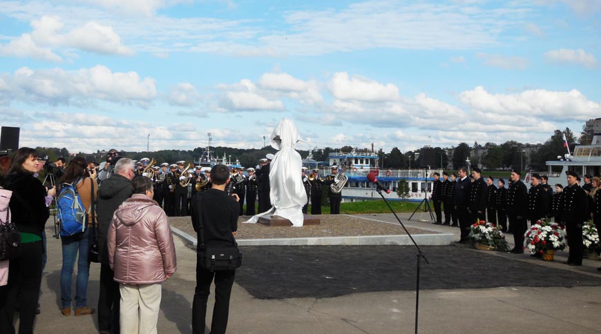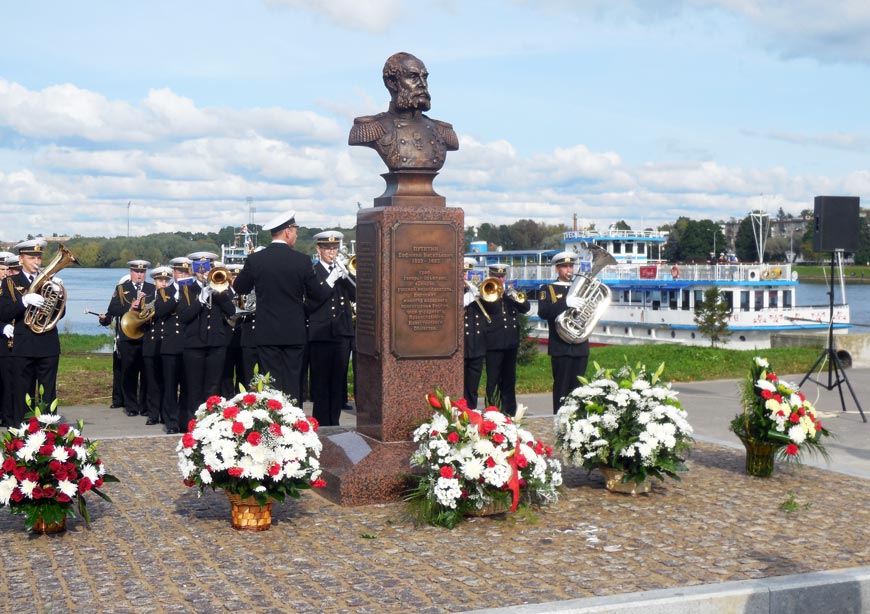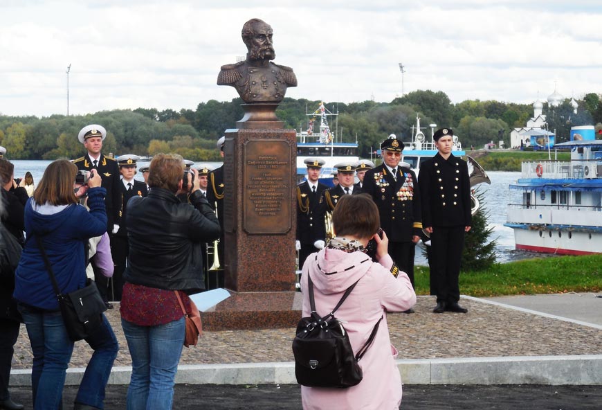 Корабли на реке Волхов выстроились в ряд напротив памятника Путятину. Ведущий объявил торжественное мероприятие открытым и зачитал краткие сведения о Е. В. Путятине.