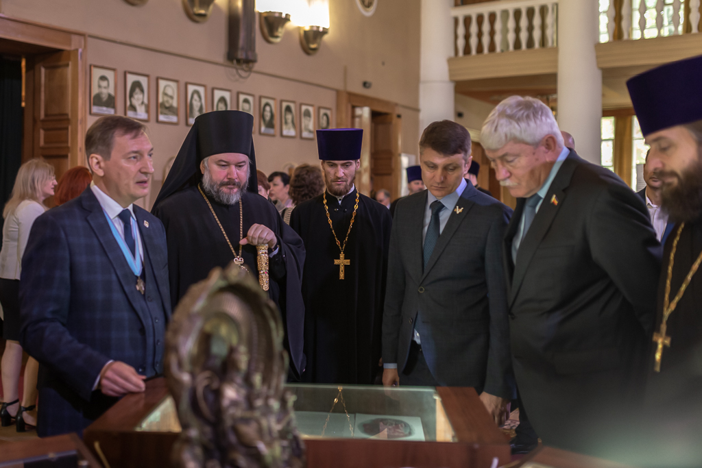 Главными святынями выставки евлогий стали аналойный кипарисовый живописный крест палестинской работы с частицей Древа Честного и Животворящего Креста Господня и мироточивая храмовая икона Божией Матери Иверской, написанная иноками святой Афонской Горы в XIX веке. Экспонаты для выставки были собраны со всей Шахтинской епархии: их предоставили многие храмы области и частные коллекционеры.