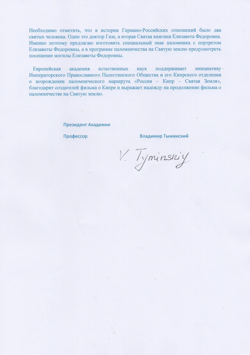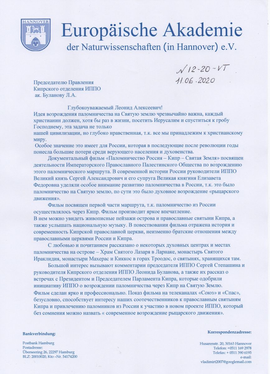 Президент Европейской Академии естественных наук (ЕАЕН) Владимир Тыминский направил письмо-отзыв о документальном фильме «Паломничество Россия-Кипр-Святая Земля» руководителю Кипрского отделения ИППО, академику ЕАЕН Леониду Буланову.