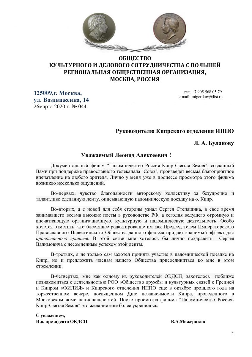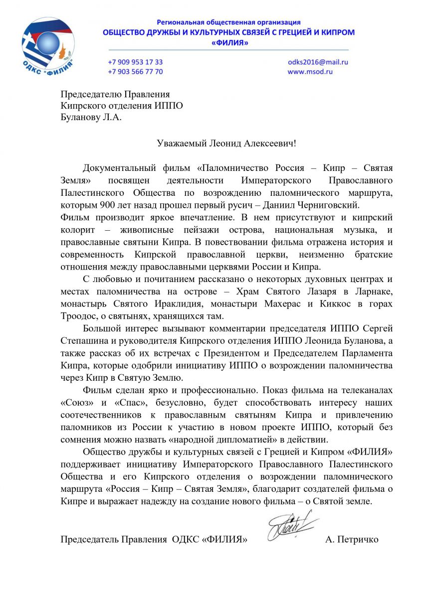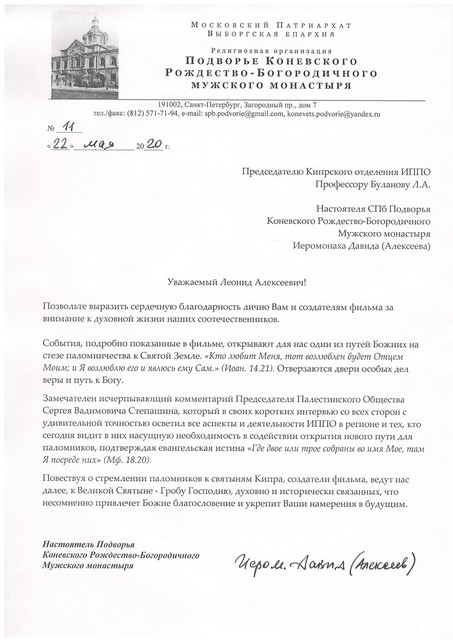 В адрес руководителя Кипрского отделения ИППО Леонида Буланова поступил ряд отзывов о документальном фильме «Паломничество Россия – Кипр – Святая Земля».