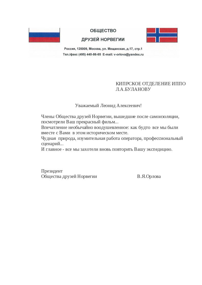 От президента Общества друзей Норвегии Орловой Валентины Яковлевны