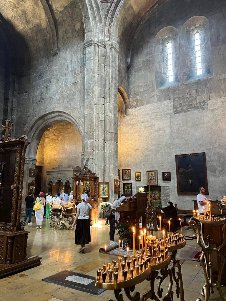 Интерьер главного собора Грузии, древние иконы и средневековые настенные росписи, мужское многоголосие Патриаршего хора, тысячи верующих, множество зажженных свечей – всё это производит неизгладимое впечатление. Общий строй богослужения, язык которого понятен только его носителям, воодушевляет на молитву, обращенную к Богу.