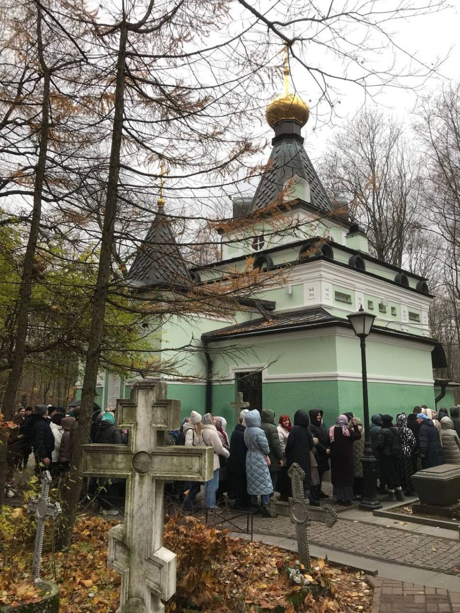 Бывая в Северной столице, нельзя не посетить Смоленское кладбище, куда тысячи петербуржцев и гостей города стекаются ради одного – помолиться святой блаженной Ксении Петербургской. Несмотря на прохладную и ветреную погоду, мы вместе с другими паломниками постояли в очереди к матушке Ксении: внутри часовни священник совершал молебен, снаружи люди вторили словам молитв, поминая своих близких и родных. Оказавшись внутри часовни, участники нашей паломнической группы поклонились почивающим под мраморным надгробием мощам святой, а игумен Серафим (Кравченко) помазал всех освященным елеем.