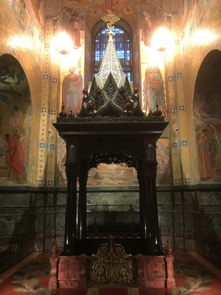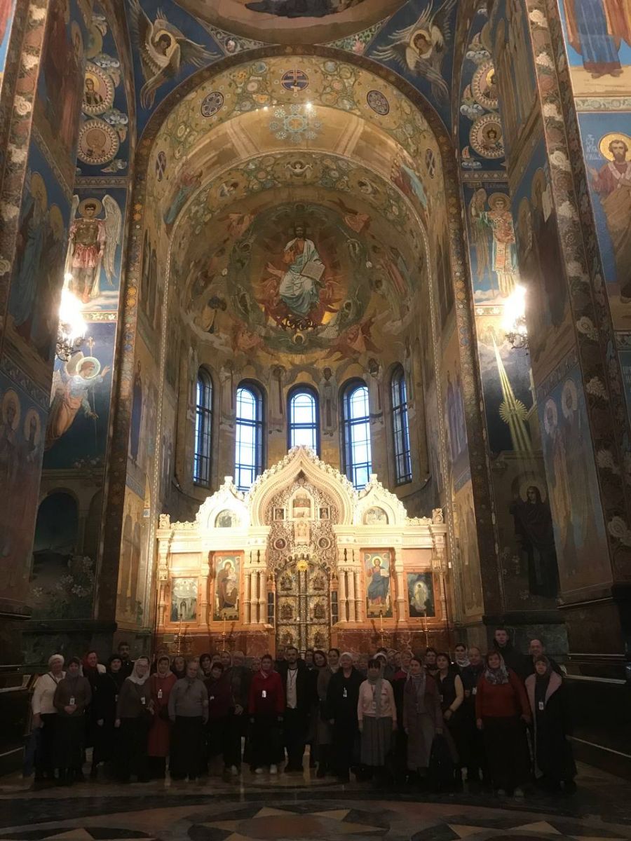 Воскресный день (12 ноября) начался с Божественной литургии в Храме Спаса на Крови: богослужение возглавил настоятель храма, секретарь Санкт-Петербургского Епархиального управления митрофорный протоиерей Сергий Куксевич, которому сослужили клирики Воскресенского собора и игумен Серафим (Кравченко). Великолепие внутреннего убранства и стройное пение мужского хора создали особую молитвенную атмосферу. По окончании богослужения протоиерей Сергий обратился к паломникам со словом приветствия, оказав радушие и гостеприимство. Затем для нас была проведена краткая экскурсия, в ходе которой нашей группе было показано место приведшего к гибели покушения на Императора Александра II и рассказано об истории и содержании настенных мозаичных панно.