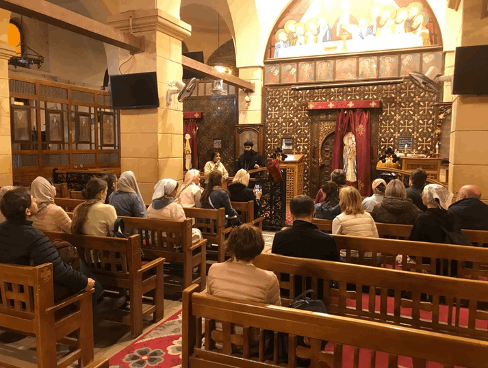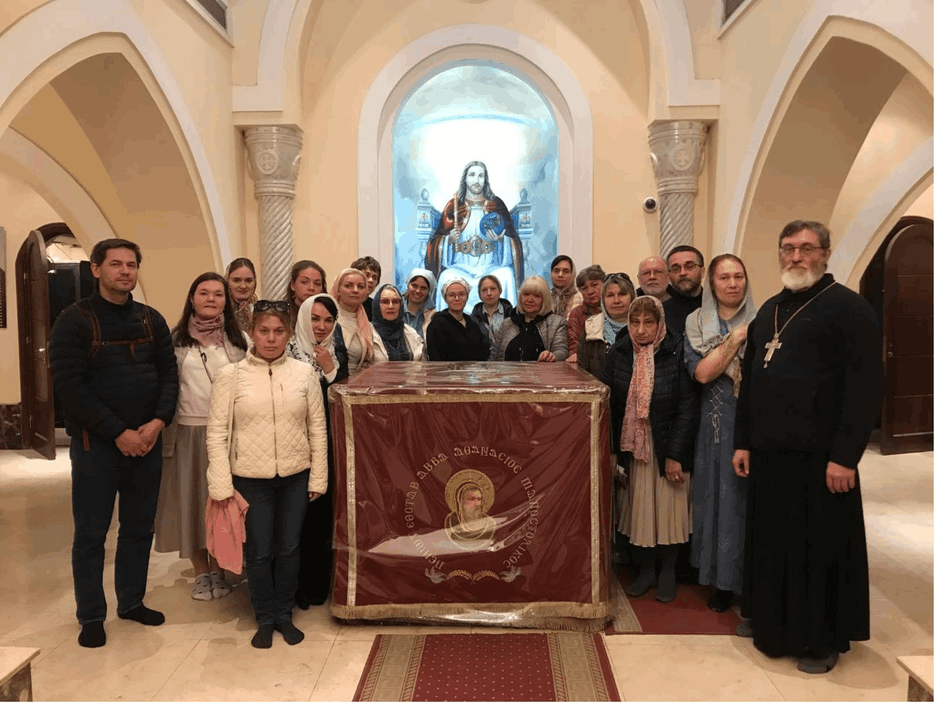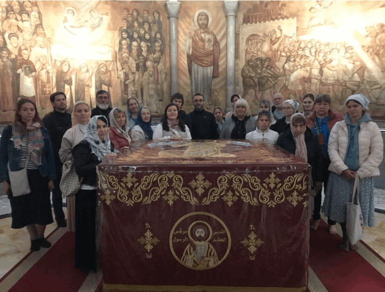 Потом богомольцы поехали в Кафедральный собор святого апостола Марка (Коптская Церковь), где поклонились мощам евангелиста Марка и святителя Афанасия, архиепископа Александрийского, перед честными останками которых входящие в состав паломнической группы священники отслужили молебны.