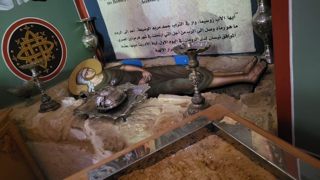 Далее пеший путь привел нас к руинам монастыря Богородицы, возведенного на месте подвигов преподобной Марии Египетской и ее встречи со старцем Зосимой. Здесь, у мозаичной иконы преподобных Зосимы и Марии, игуменом Серафимом (Кравченко) был совершен молебен.