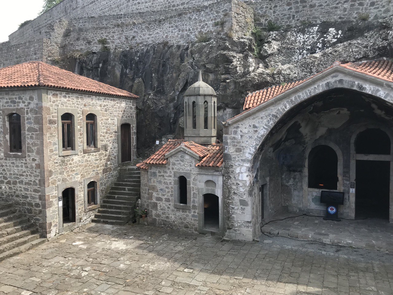 Успели мы заехать и в трапезундский монастырь "Panagia Theoskepastos", возведенный на вершине горы. В пещерном храме и в соседней церкви слегка заметны фрески. Опустошенными и безлюдными стоят монашеский корпус, дом паломника, церковь равноапостольного царя Константина и трапезная. Нет колоколов на колокольне и крестов на храмах.